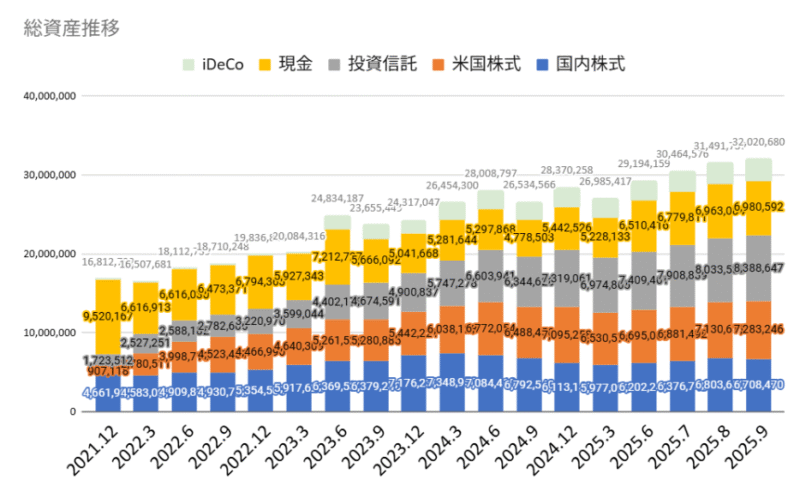 総資産は合計で3,202万円程度となっていて、前月の3,149万円から+53万円程度となっています。