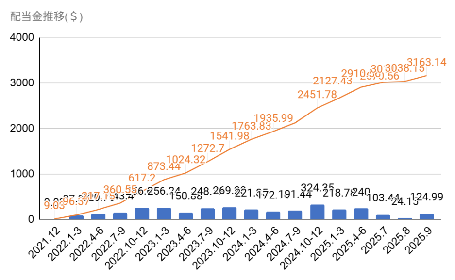 9月のドルベース配当分配金は、125$で日本円で18,500円程度になりました。